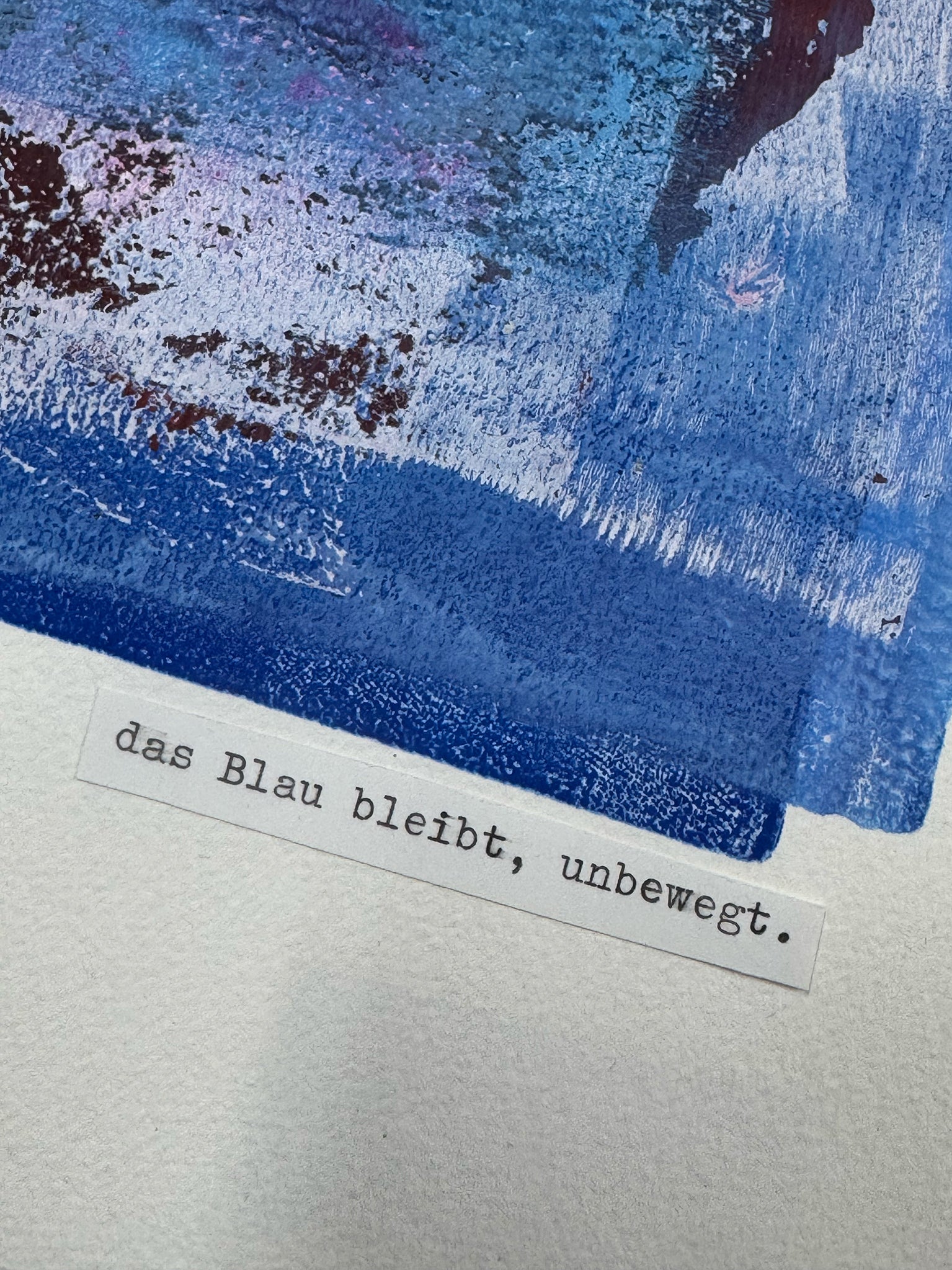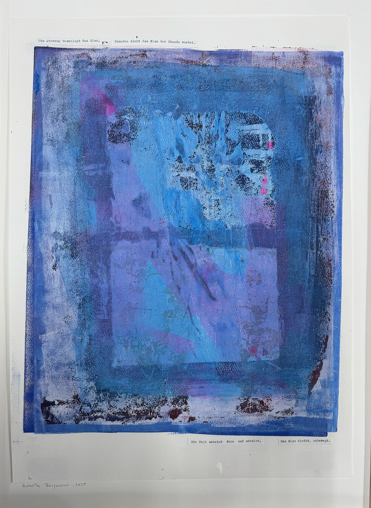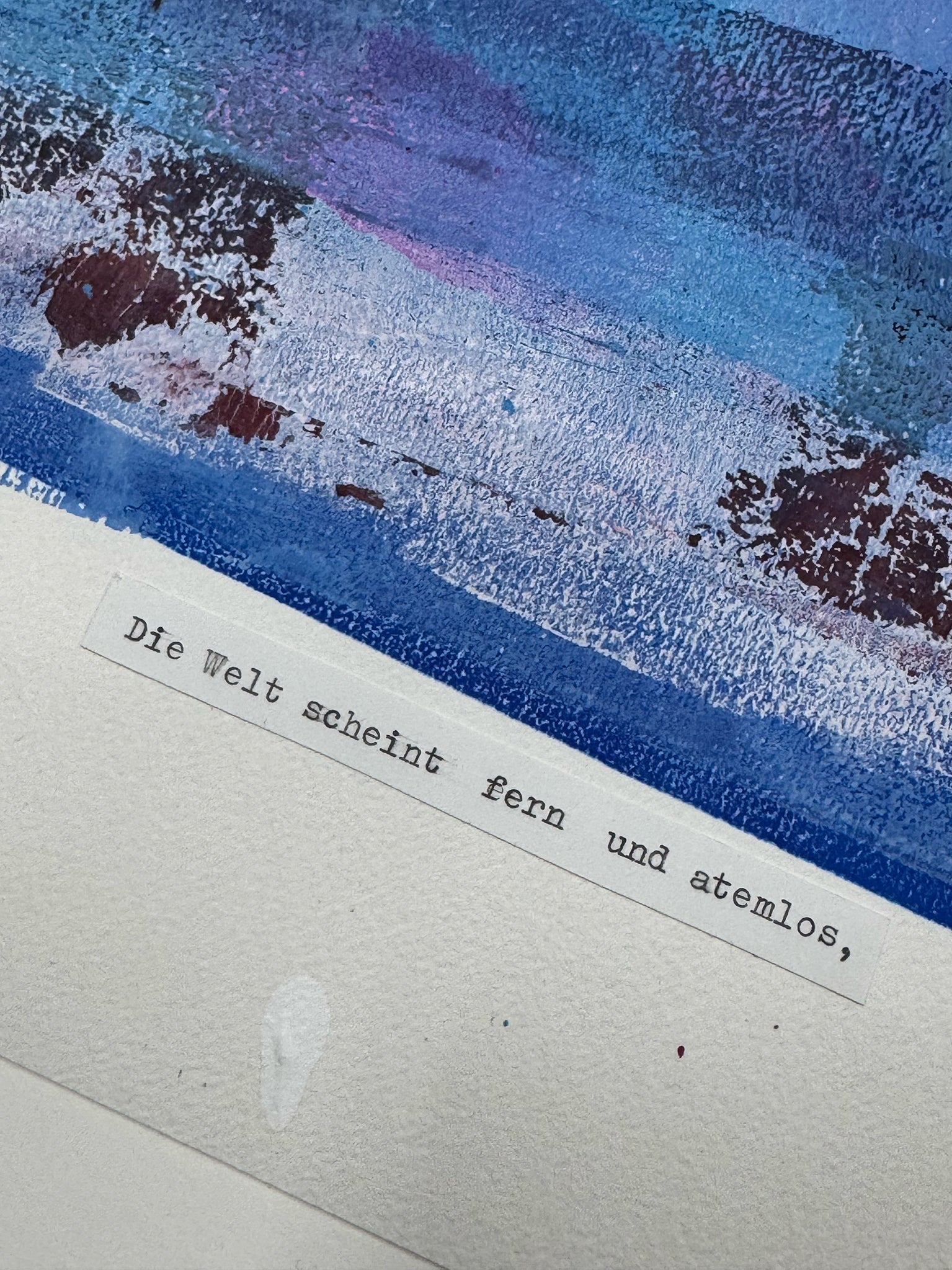 Acrylfarbe auf Papier, Gedicht mit Schreibmaschine, Leim, datiert und signiert am unteren Rand, Bilderrahmen aus weiß lasiertem Holz (Qualitätsrahmen Max Aab), 50 x 70 x 2 cm, Glas, Unikat, 2025