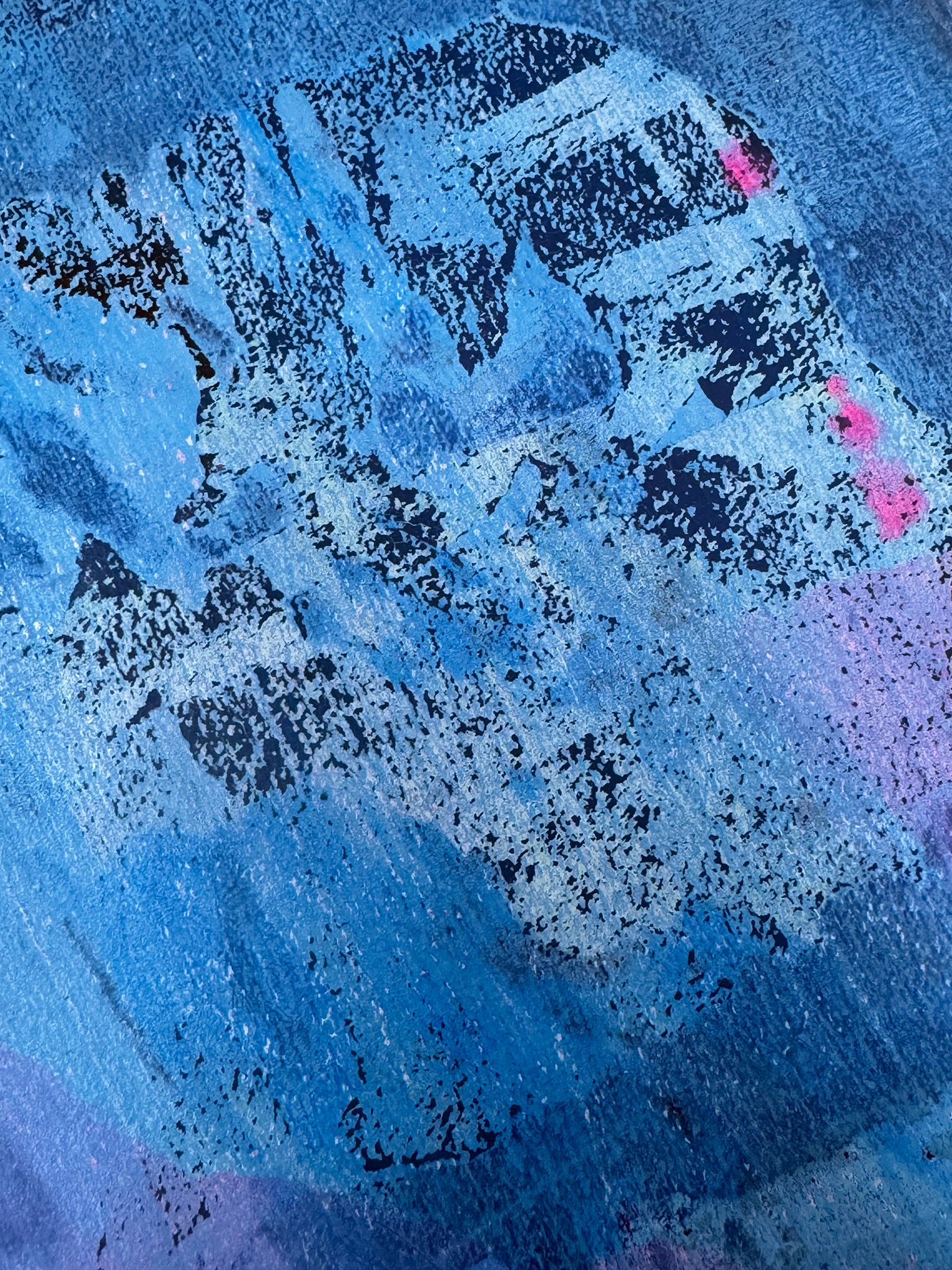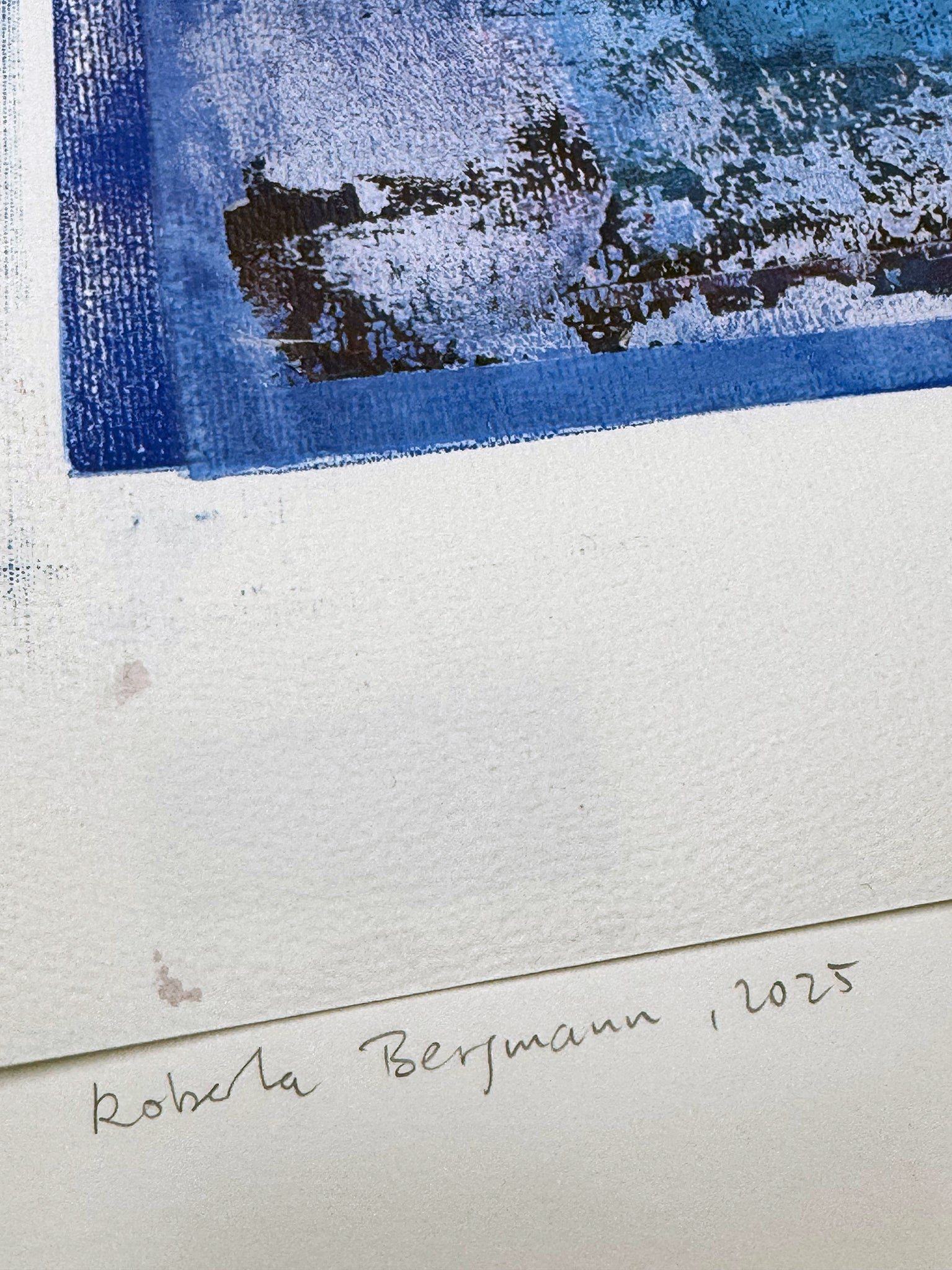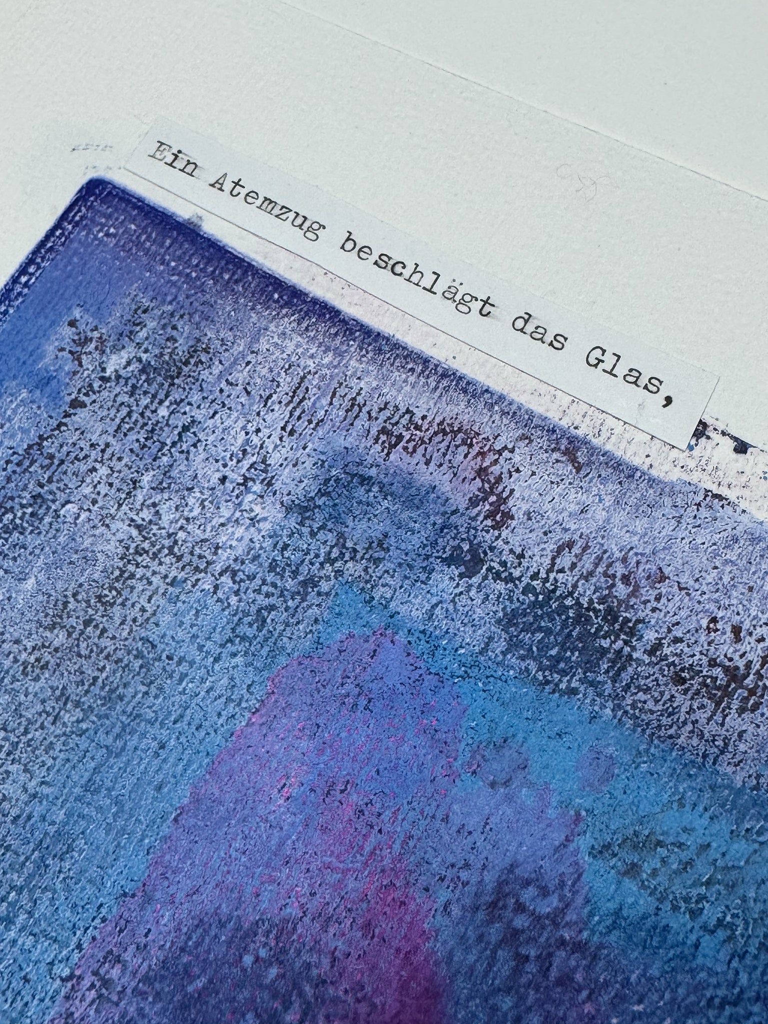 Acrylfarbe auf Papier, Gedicht mit Schreibmaschine, Leim, datiert und signiert am unteren Rand, Bilderrahmen aus weiß lasiertem Holz (Qualitätsrahmen Max Aab), 50 x 70 x 2 cm, Glas, Unikat, 2025