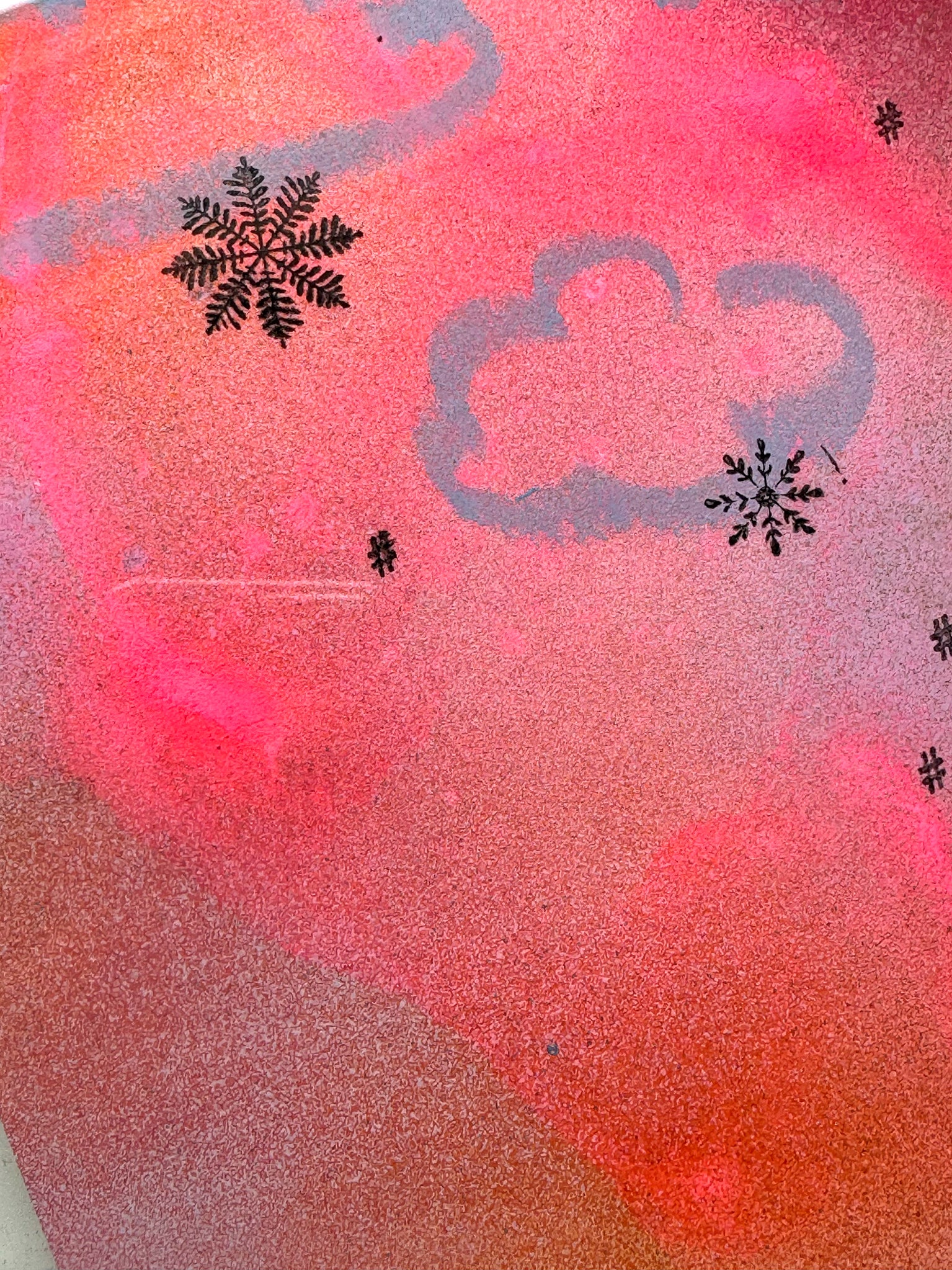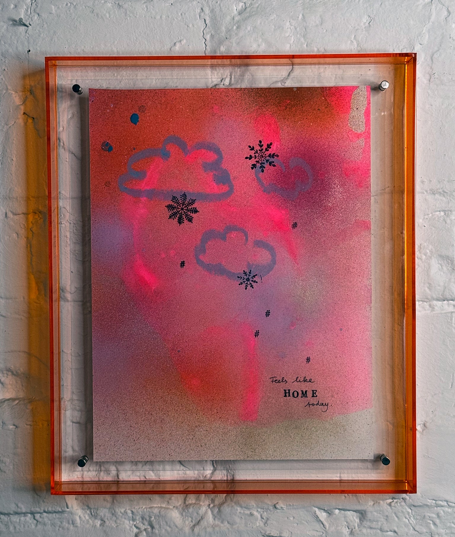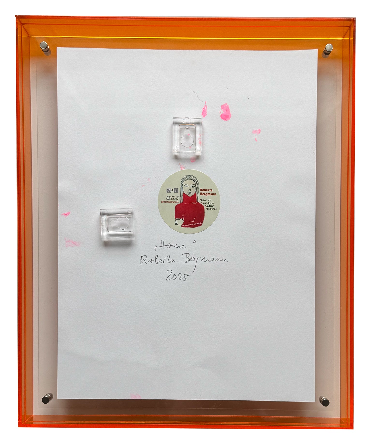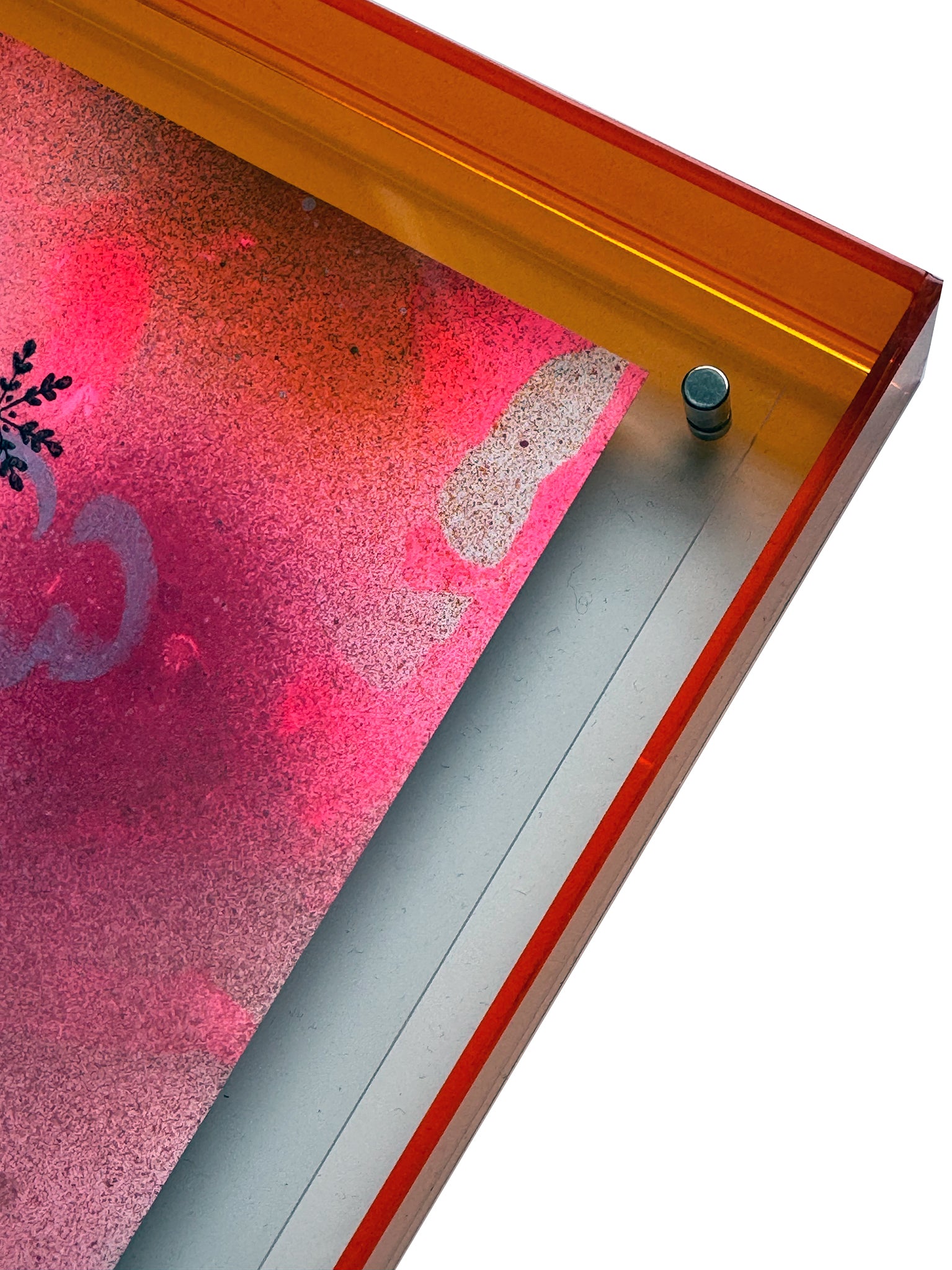 Acryltusche auf Aquarellpapier, Text mit Pigmenttusche und Stempel mit Stempelfarbe, Bilderrahmen aus orangenem Neon-Acrylglas mit Metallschrauben (Qualitätsrahmen), Rahmen: 26 x 35 x 4cm, cm, signiert und datiert auf Rückseite (siehe Foto), Unikat, 2025