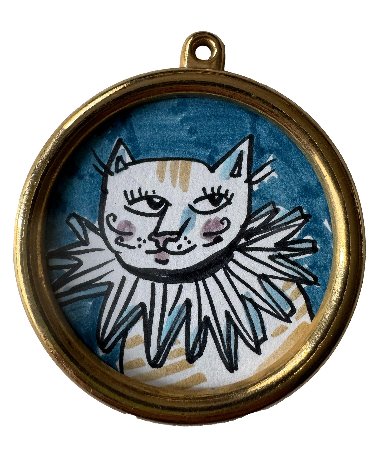 Fineliner und Ecoline-Marker auf Papier, schwerer, runder Rahmen aus Messing (?) mit Plexiglas, Maße: 6 cm Durchmesser, kein Glas, signiert und datiert auf Rückseite, Unikat von Roberta Bergmann