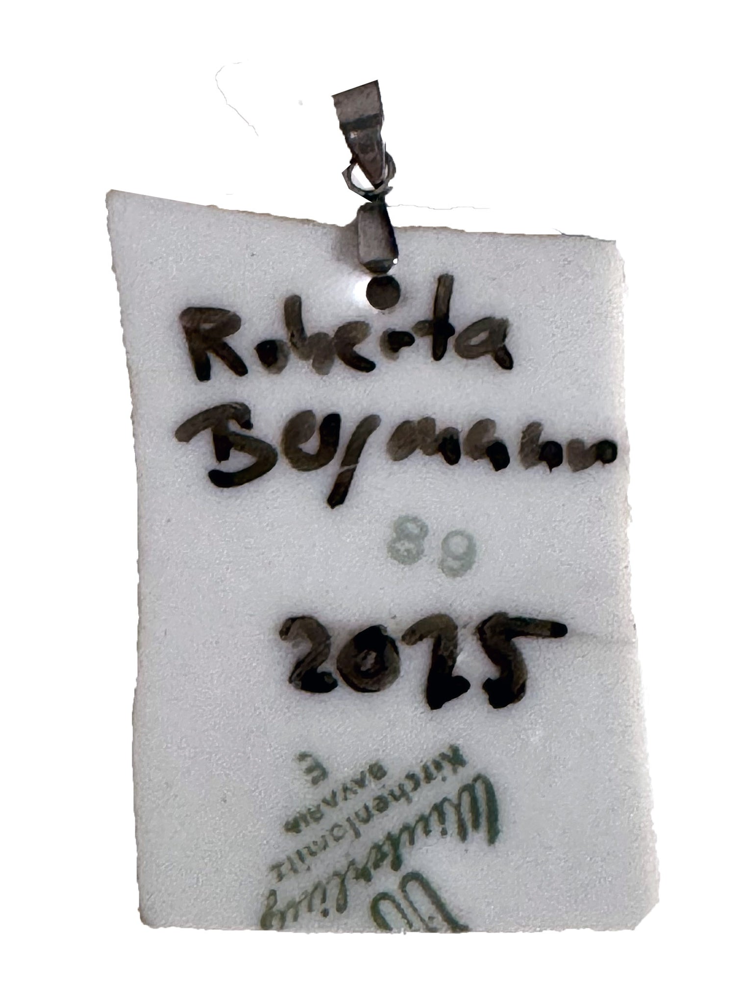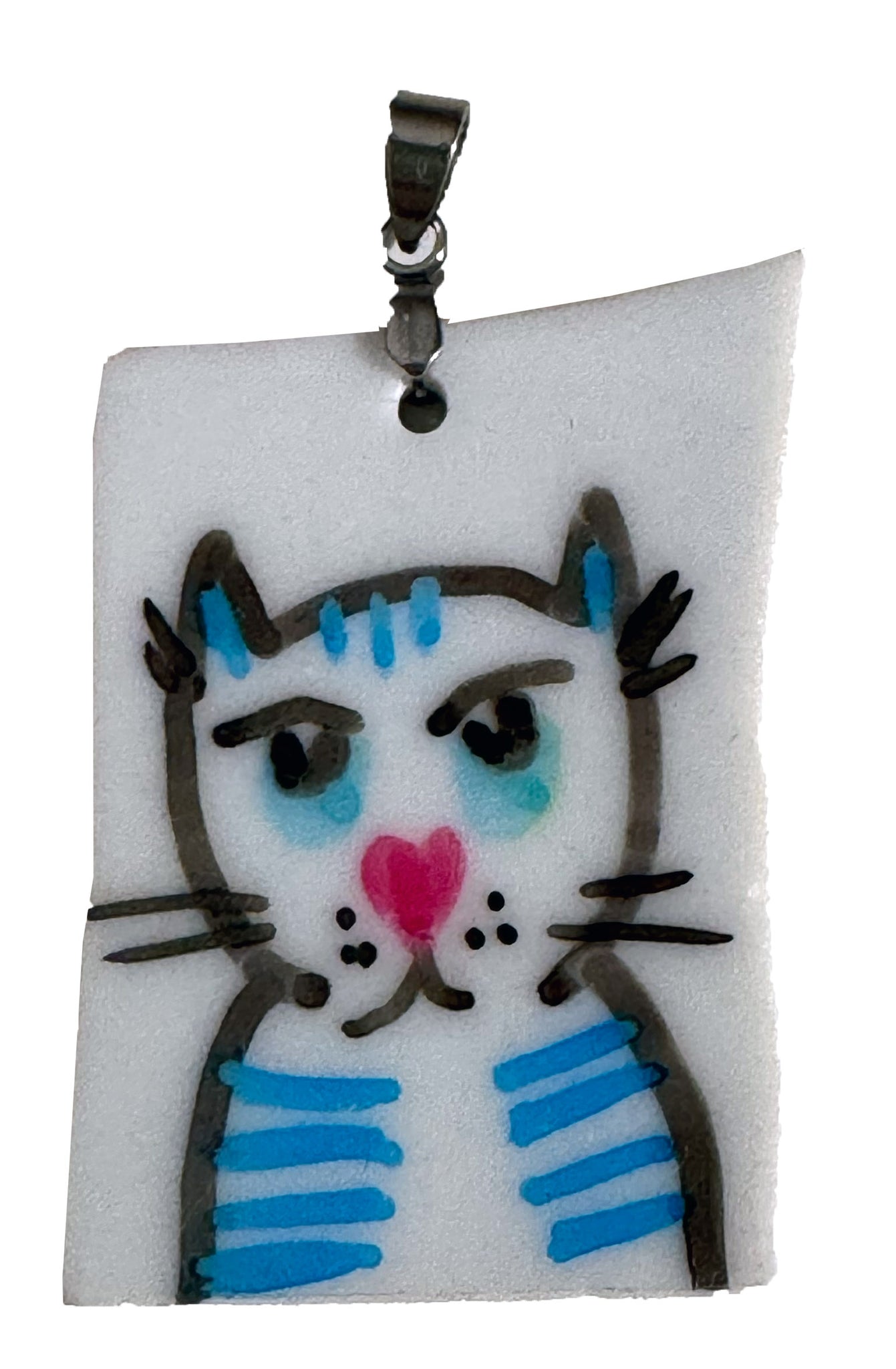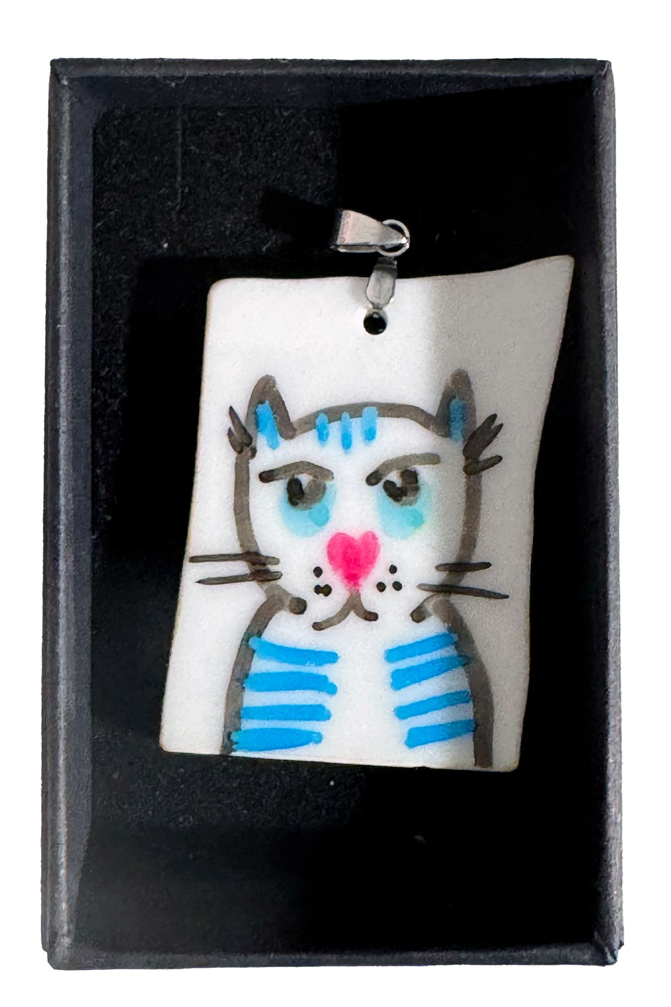 Anhänger für eine Halskette, weiße Porzellanscherbe (Teller) mit Originalzeichnung, Porzellanmalfarben, gebrannt, spülmaschinenfest, wasserfest, Maße ca.:34 cm hoch x 4,5 cm breit, mit Edelstahl-Anhängerhalterung, signiert und datiert auf Rückseite, in schwarzer Schmuckschatulle, Unikat von Roberta Bergmann