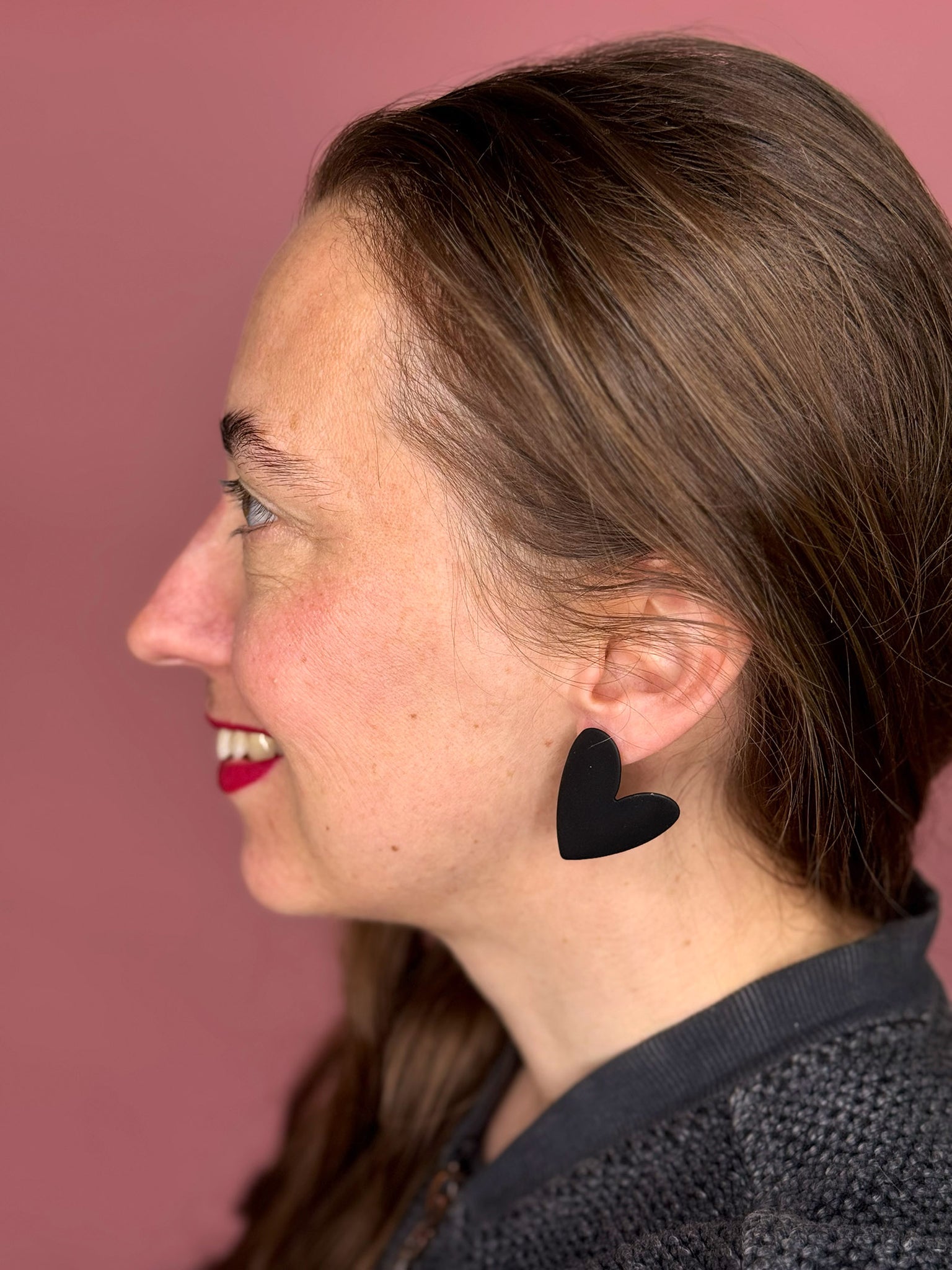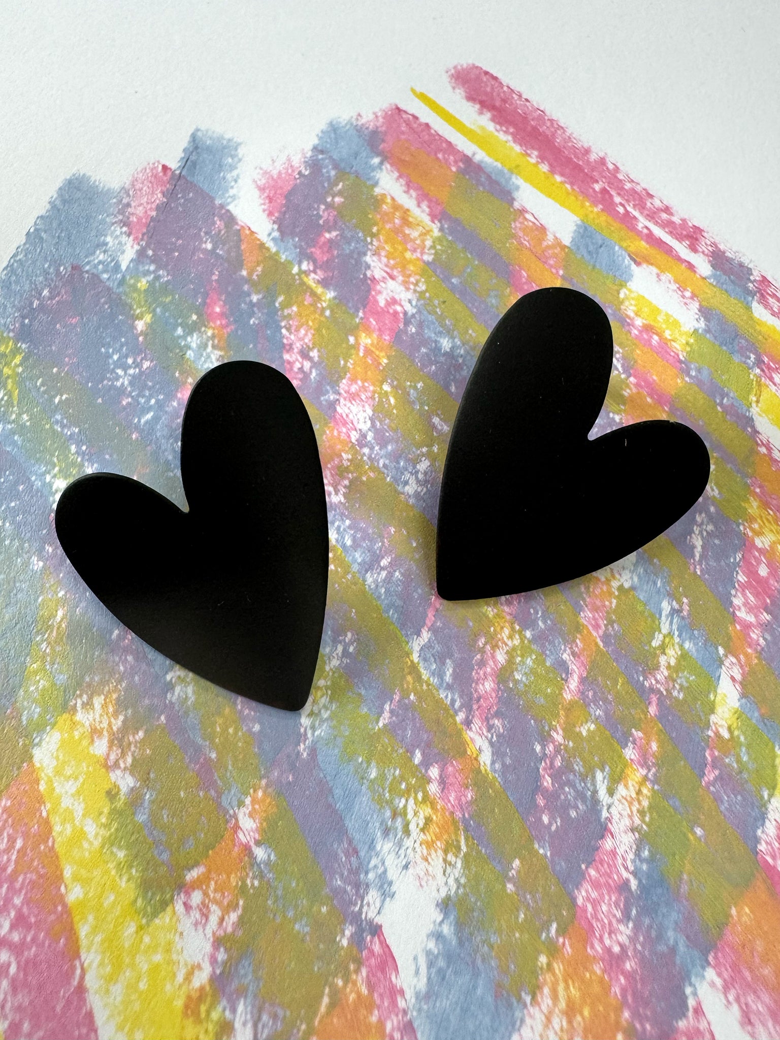 Ein Paar schwarze Herzen-Ohrringe als Stecker, aus mattem Metall, siehe Fotos,